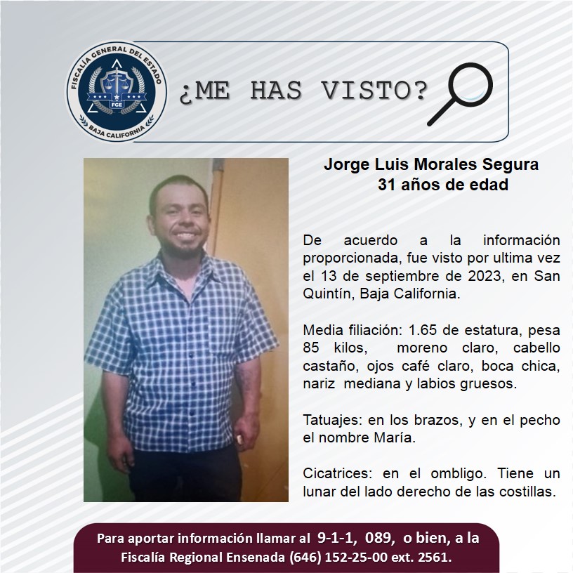ENSENADA, B. C., A 15 DE SEPTIEMBRE DE 2023.- La Fiscalía General del Estado (FGE), solicita el apoyo de la ciudadanía para localizar a Jorge Luis Morales Segura, de 31 años de edad.
