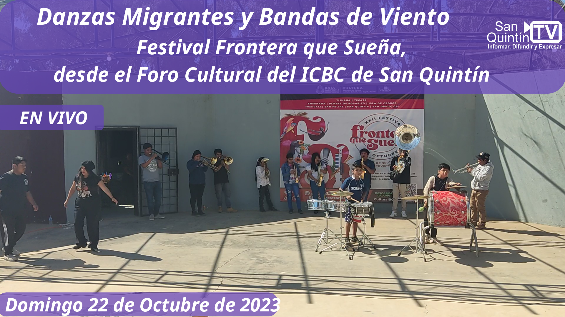 Evento denominado Danzas migrantes y bandas de viento, cuya finalidad fue reunir y expresar la multiculturalidad de nuestro municipio, participaron grupos de danzantes de varias escuelas y grupos étnicos, en el marco del Festival Frontera que Sueña de todo el mes de octubre, este evento fue realizado por Instituto de Cultura de Baja California, Delegación San Quintín, encabezado por la Mtra. Olga Loya Torres.