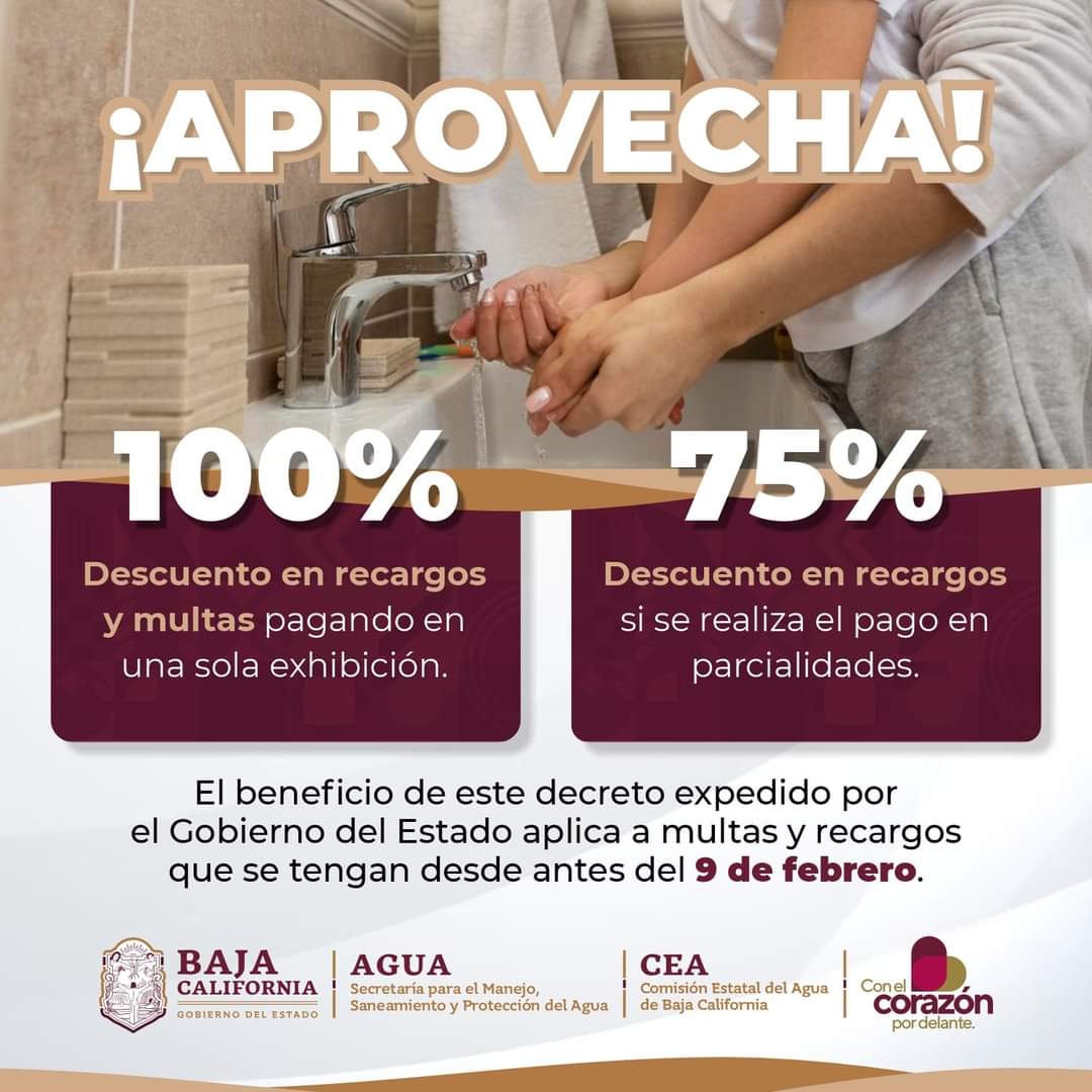 MEXICALI.- El Secretario del Agua, Víctor Daniel Amador Barragán informó que las y los bajacalifornianos todavía pueden acceder a la condonación de multas y recargos en el pago del agua, la cual finaliza este 29 de junio de 2024.