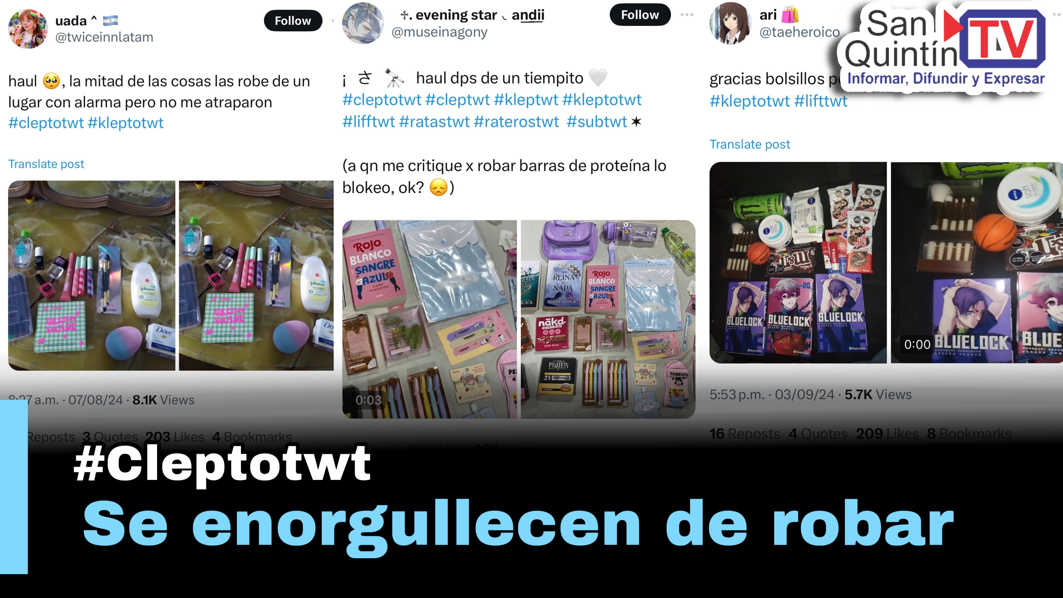 Hace un tiempo se había formado una comunidad en Twitter, denominada bajo el nombre de #cleptotwt, quienes son jóvenes que hurtan cosas y después publican su “hazaña” en redes, compartiendo consejos para robar o sus experiencias con más personas.