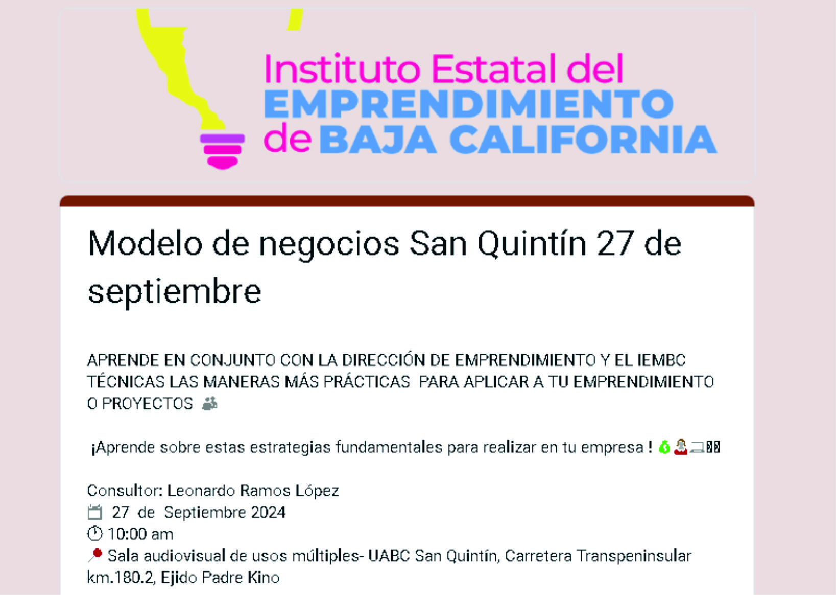 SAN QUINTIN.- Con el objetivo de orientar a la comunidad estudiantil y a las y los emprendedores de este municipio, la Secretaría de Economía e Innovación (SEI) y la Universidad Autónoma de Baja California (UABC), campus San Quintín ofrecerán el taller gratuito “Modelo de negocio”, anunció la subsecretaria de Fomento Económico, Michelle Guerrero Jaimes.