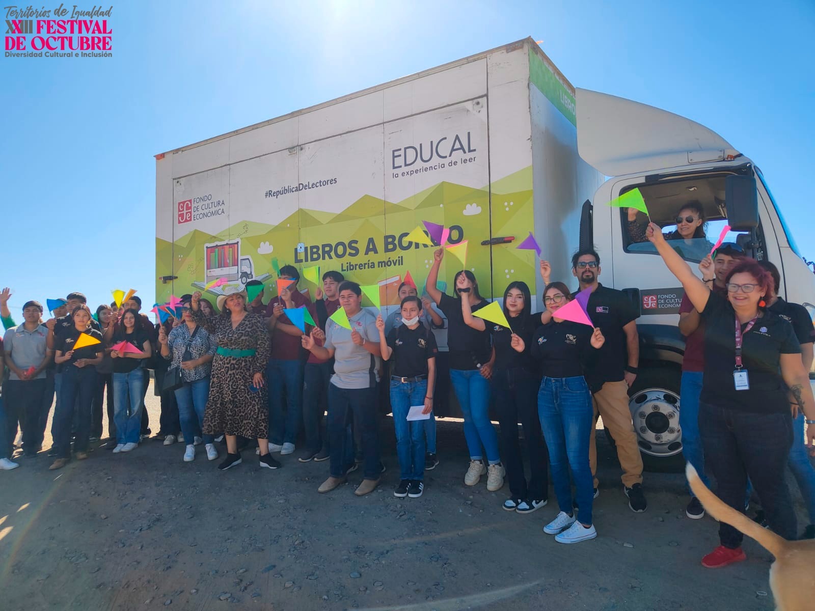 VILLA DE JESÚS MARÍA, B.C.- El Librobús del Fondo de Cultura Económica (FCE) como parte de su recorrido “Letras Peninsulares” llegó a Villa de Jesús María en Baja California, donde fue recibido por la secretaria de Cultura, Alma Delia Ábrego Ceballos acompañada de la comunidad estudiantil del CECYTE BC de este poblado y la Coordinadora de Comunicación del FCE, Sandra Montoya Cárdenas.