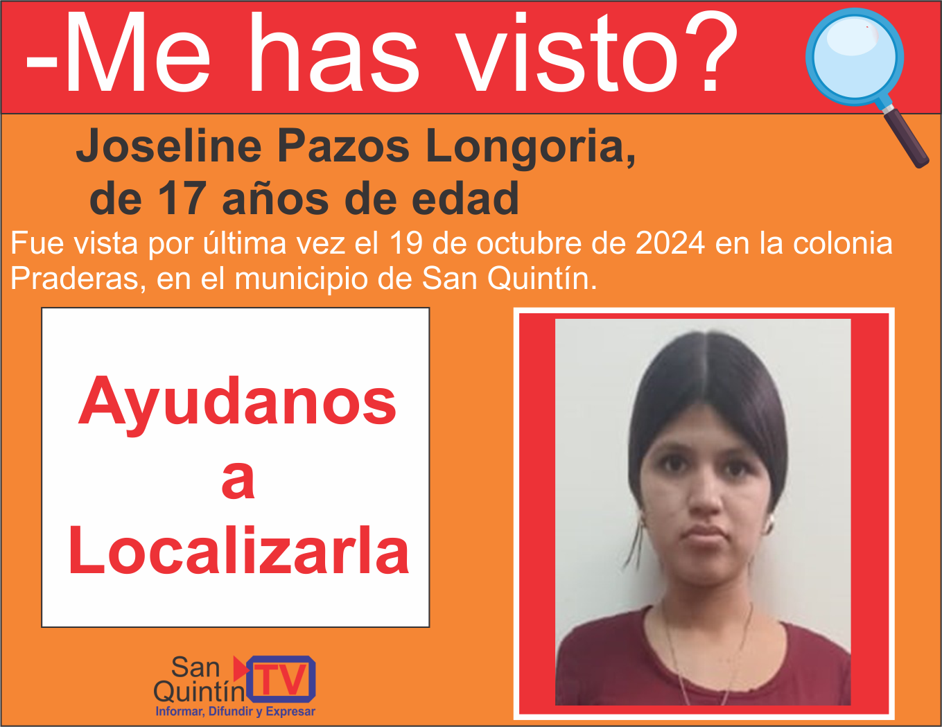 SAN QUINTÍN, BAJA CALIFORNIA, A 28 DE OCTUBRE DE 2024.- La Fiscalía General del Estado solicita la colaboración de la ciudadanía para localizar a Joseline Pazos Longoria, de 17 años de edad, quien fue vista por última vez el 19 de octubre de 2024 en la colonia Praderas, en el municipio de San Quintín, Baja California.