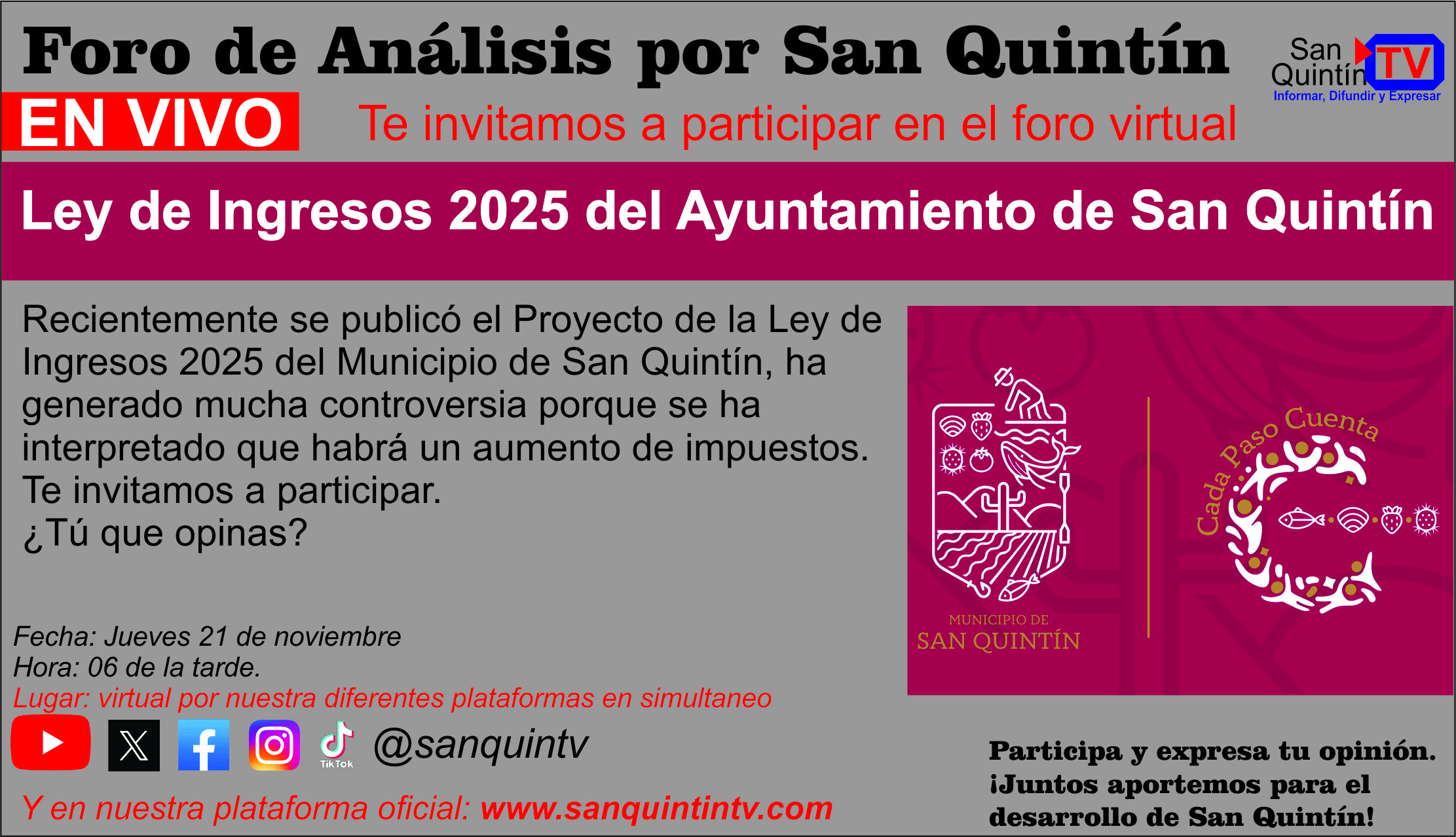 Recientemente se publicó el Proyecto de la Ley de Ingresos 2025 del Municipio de San Quintín, ha generado mucha controversia porque se ha interpretado que habra un aumento de impuestos. Los impuestos o contribuciones son necesarias para trabajos y mejoras del municipio. ¿tú que opinas?