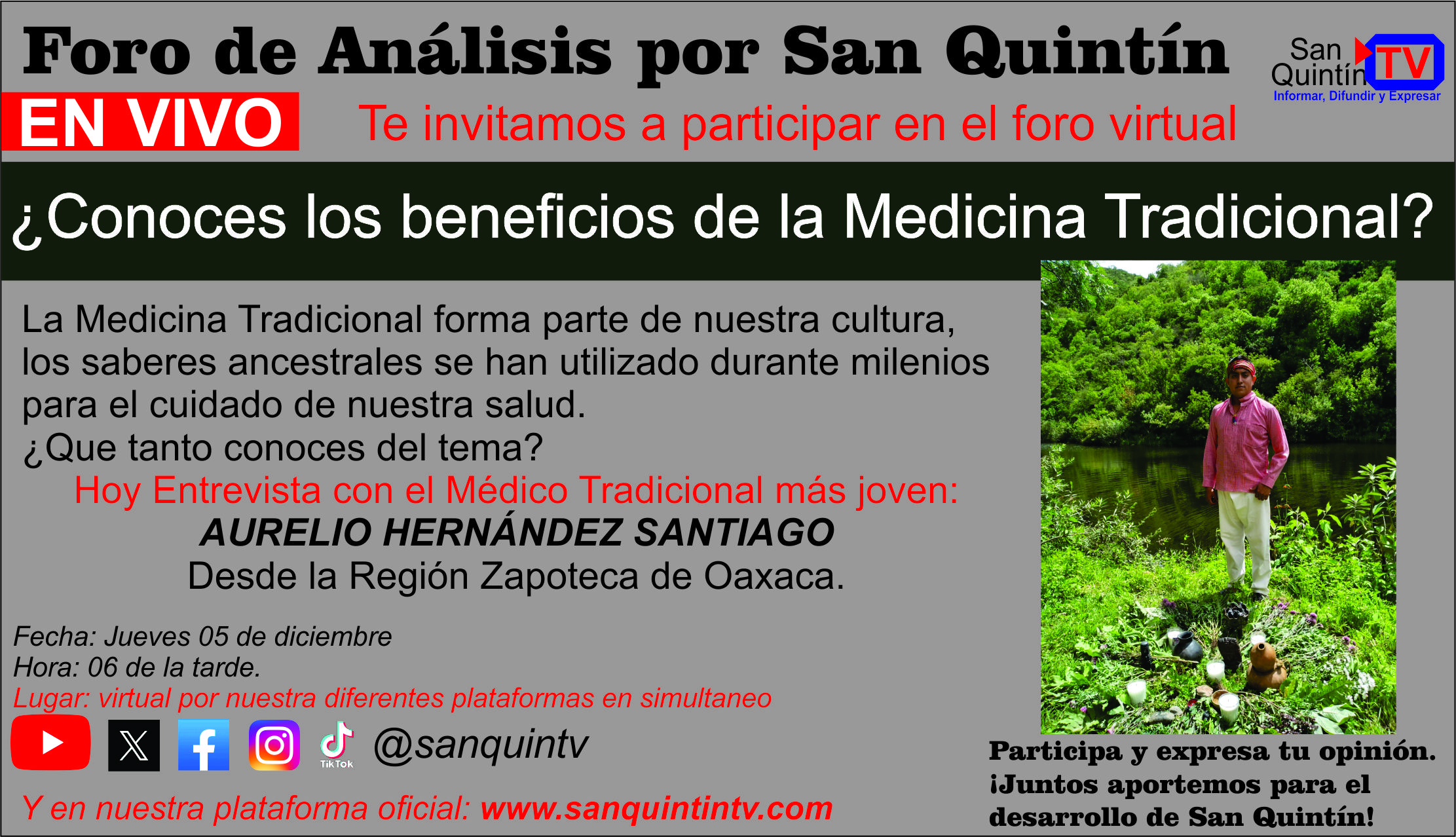 La Medicina Tradicional forma parte de nuestra cultura, los saberes ancestrales se han utilizado durante milenios para el cuidado de nuestra salud. ¿Que tanto conoces del tema? Hoy en el Foro Entrevista con el Médico Tradicional más joven de México: AURELIO HERNÁNDEZ SANTIAGO, desde la Región Zapoteca de Oaxaca.