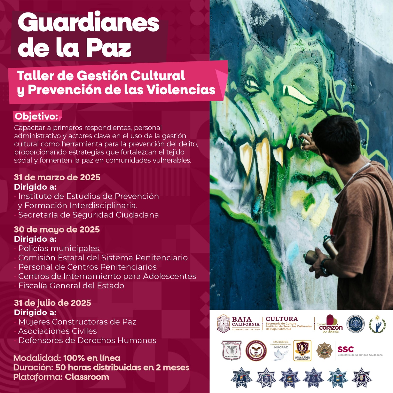 MEXICALI. – El Gobierno del Estado de Baja California a través de la Secretaría de Cultura oferta la primera edición del Taller en Gestión Cultural y Prevención de las Violencias “Guardianes de la Paz”, a personal administrativo y operativo del Instituto de Estudios de Prevención y Formación Interdisciplinaria (IEPFI) así como de la Secretaría de Seguridad Ciudadana (SSC).