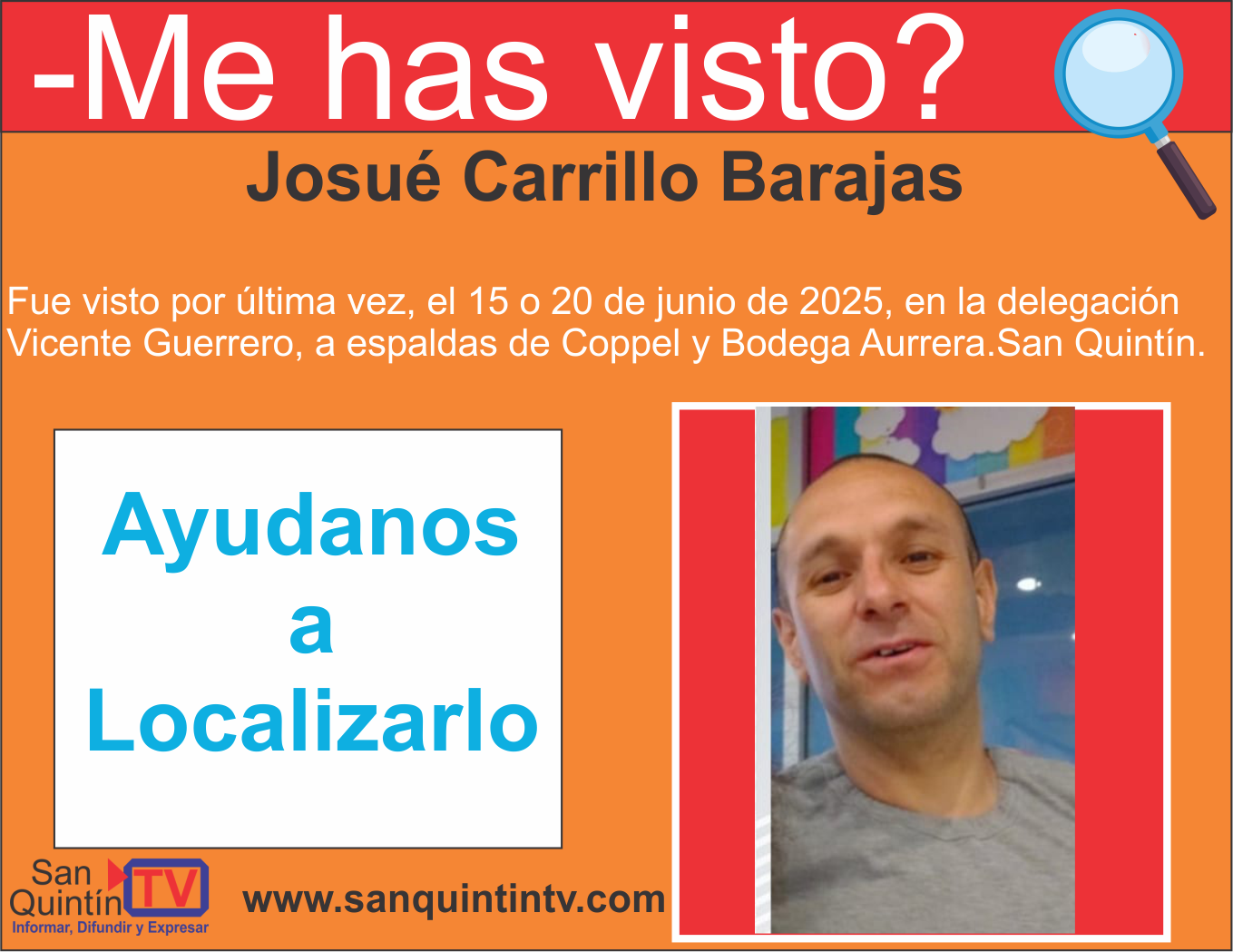 Fue visto por última vez, el 15 o 20 de junio de 2025, en la delegación Vicente Guerrero, a espaldas de Coppel y Bodega Aurrera.